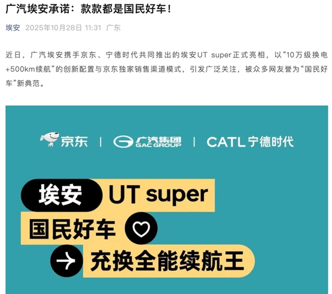 据介绍,埃安UT super可实现99秒换电,续航500km;新车将首款搭载华为云车机以及同级唯一倒车哨兵。此次与京东的合作,埃安负责整车研发制造,京东侧重用户洞察与销售渠道,宁德时代提供电池技术与换电生态,形成优势互补。
