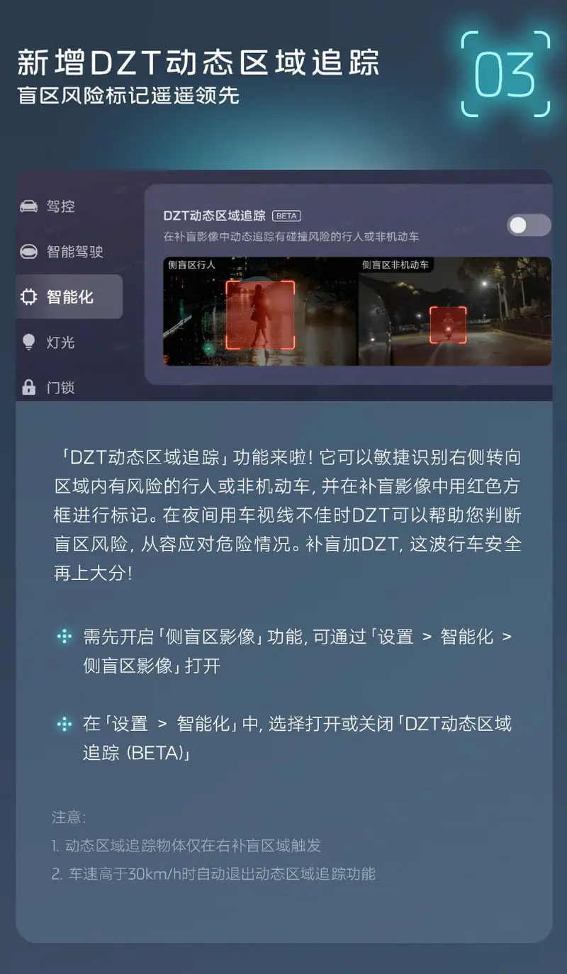 辆或前车急刹等可能发生危险的场景也可启用;同步上线了紧急车道保持功能(ELK),在紧要关头,为用户行车多添一份安全保障,让驾驶更安心。