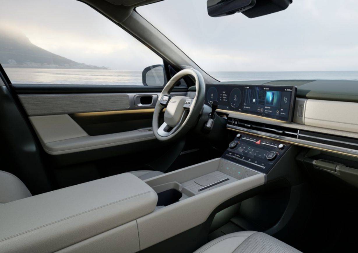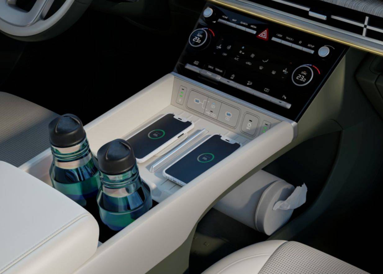 内饰这有种复古未来的感觉,双联屏当然没有缺席,在中控保留了不少实体按键,方便盲操,非常的国际车企作风。整体设计比较的简约,用料丰富,层次感不错。而且还配了两个无线充电板以及一大堆充电接口。