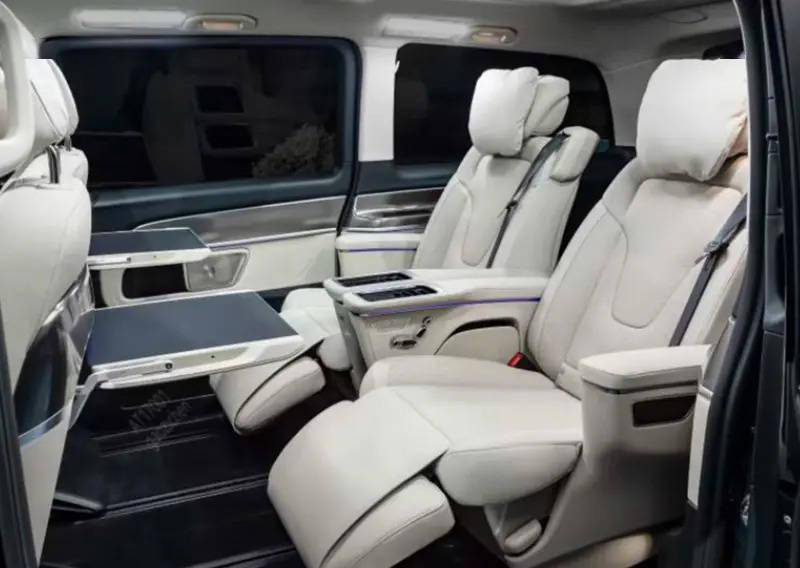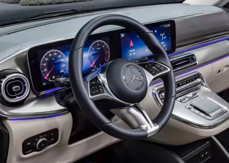 内饰方面,新款车型都采用了双联屏设计,集成了最新的 MBUX 信息娱乐系统。威霆和威霆新能源的仪表盘是 5.5 英寸彩色屏幕,中控屏是 10.25 英寸触摸屏;而 V 级和 EQV 则都配备了双 12.3 英寸显示屏。同时,新款车型还增加了许多实用和舒适的功能,比如手机无线充电板、方向盘加热、64 色氛围灯、暗后照明等。