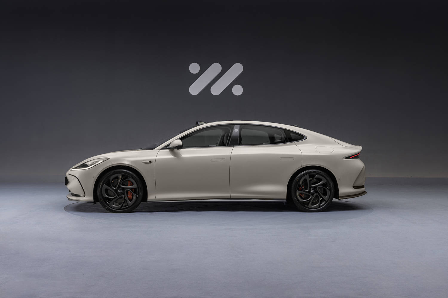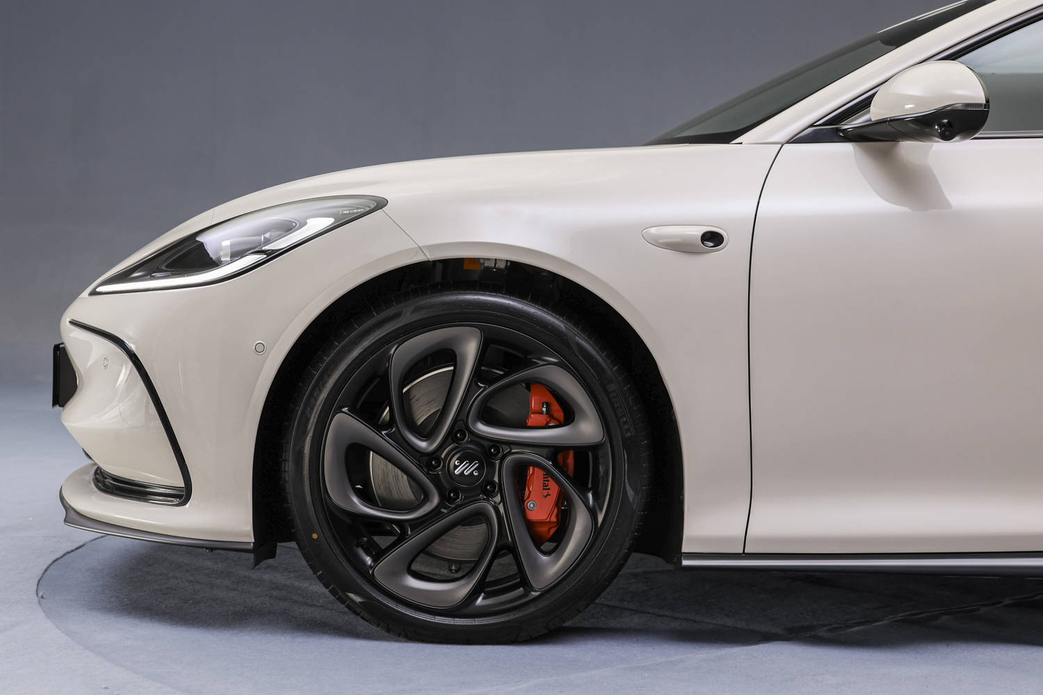 在车侧,可以看到智己L6采用的是溜背设计,整体线条流畅,车身高度和整体重心显得很低,更动感。在细节上,智己L6同样配备了无框车门以及智己标志性的花瓣式轮圈。