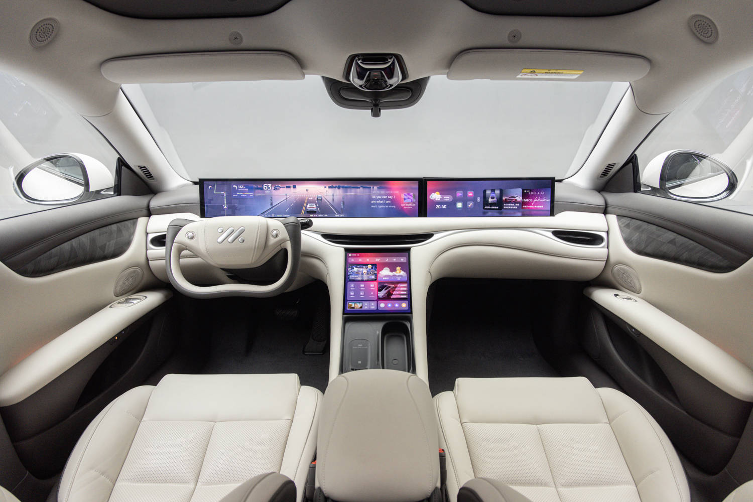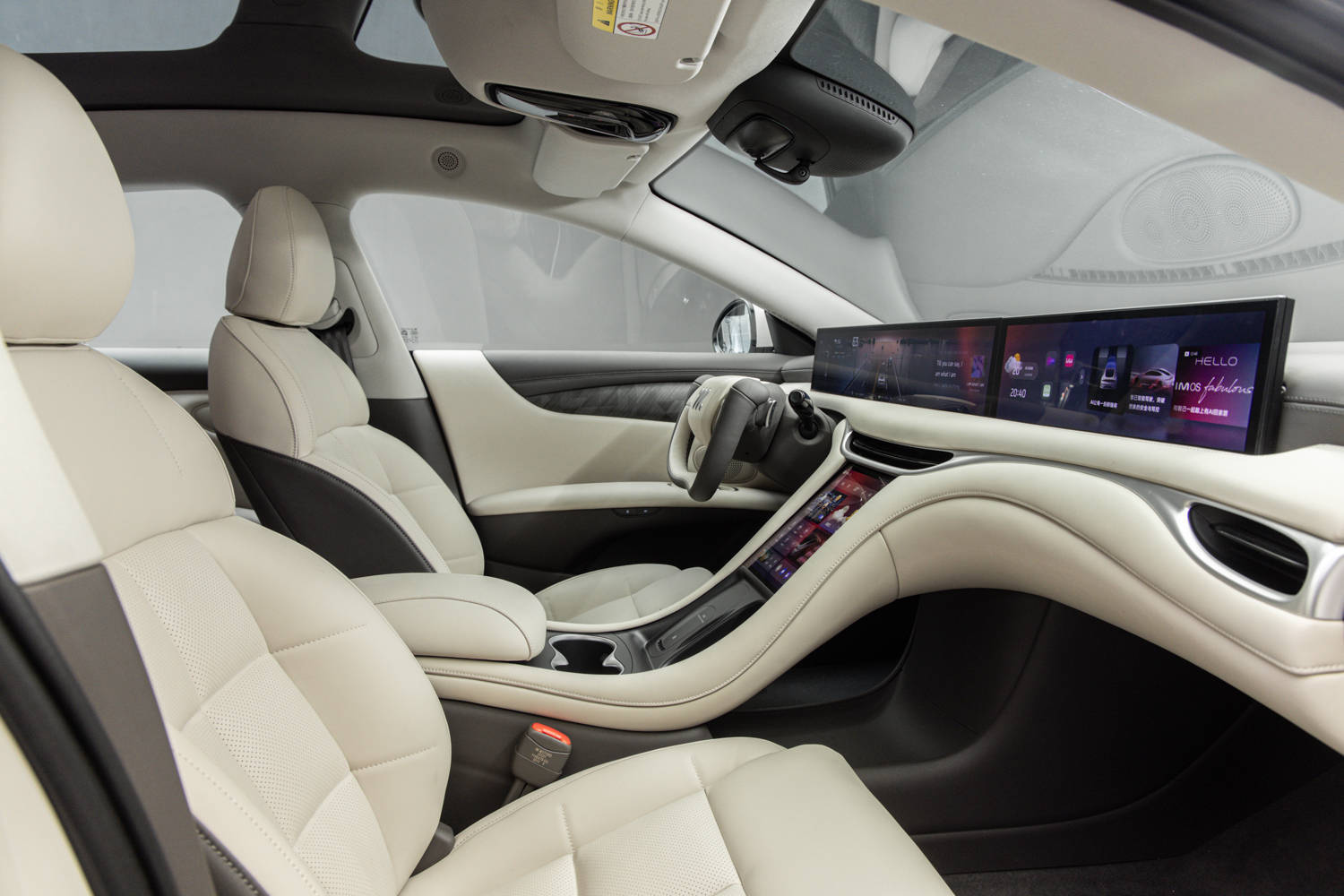内饰方面,车内在整体设计上没有给我们太多惊喜,整体造型布局和此前智己品牌车型如出一辙,车内最引人注目的就是贯穿中控台上方的连屏,T字型的布局很简洁,半幅式方向盘也依旧作为选装出现在了这台车上。