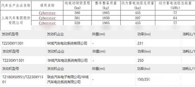 Cyberster提供3种动力可选,单电机后驱车型分为2种调校,最大功率分别为231kW和250kW;双电机车型前、后电机最大功率分别为150kW和250kW。新车搭载64kWh或77kWh三元锂电池组,对应续航里程为501km、520km或580km。