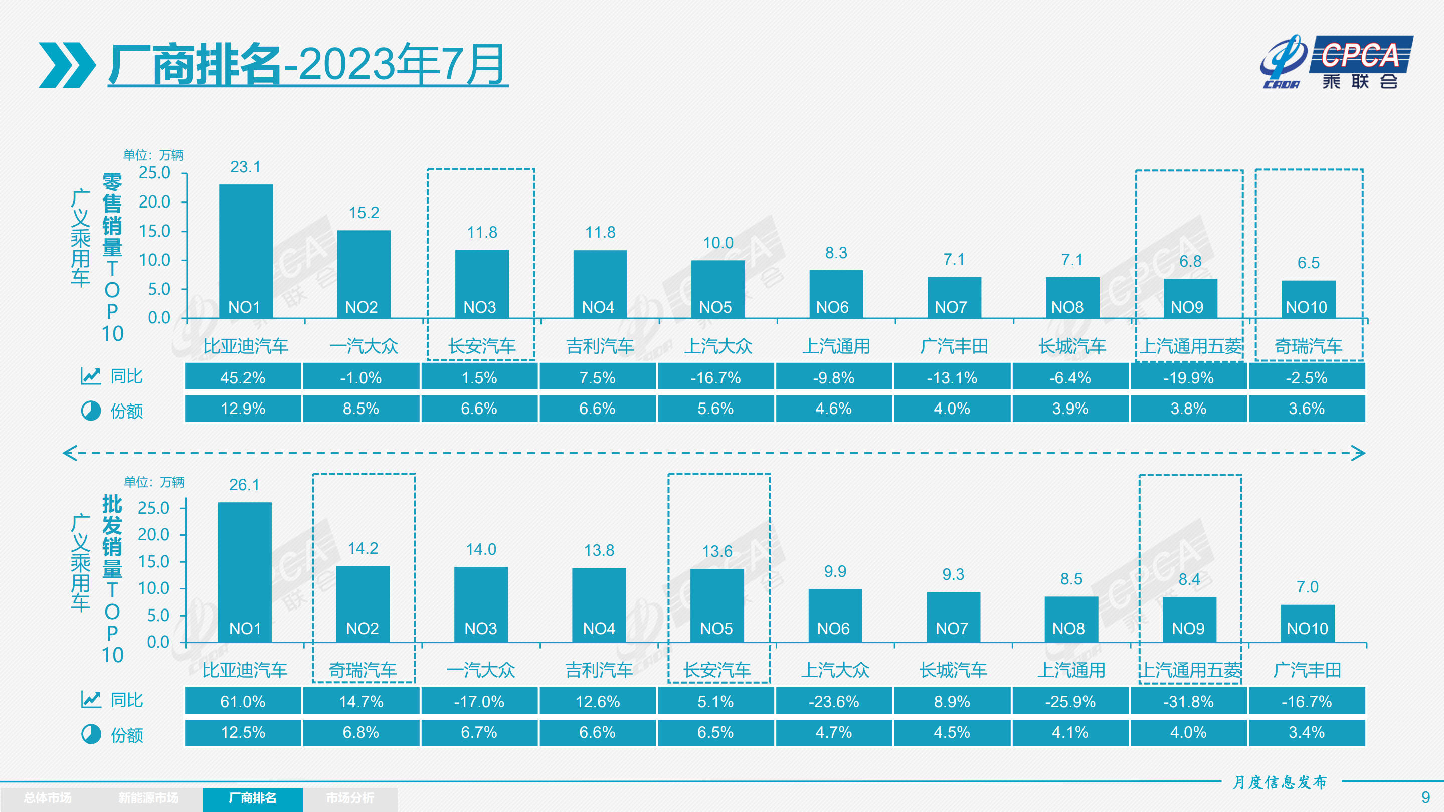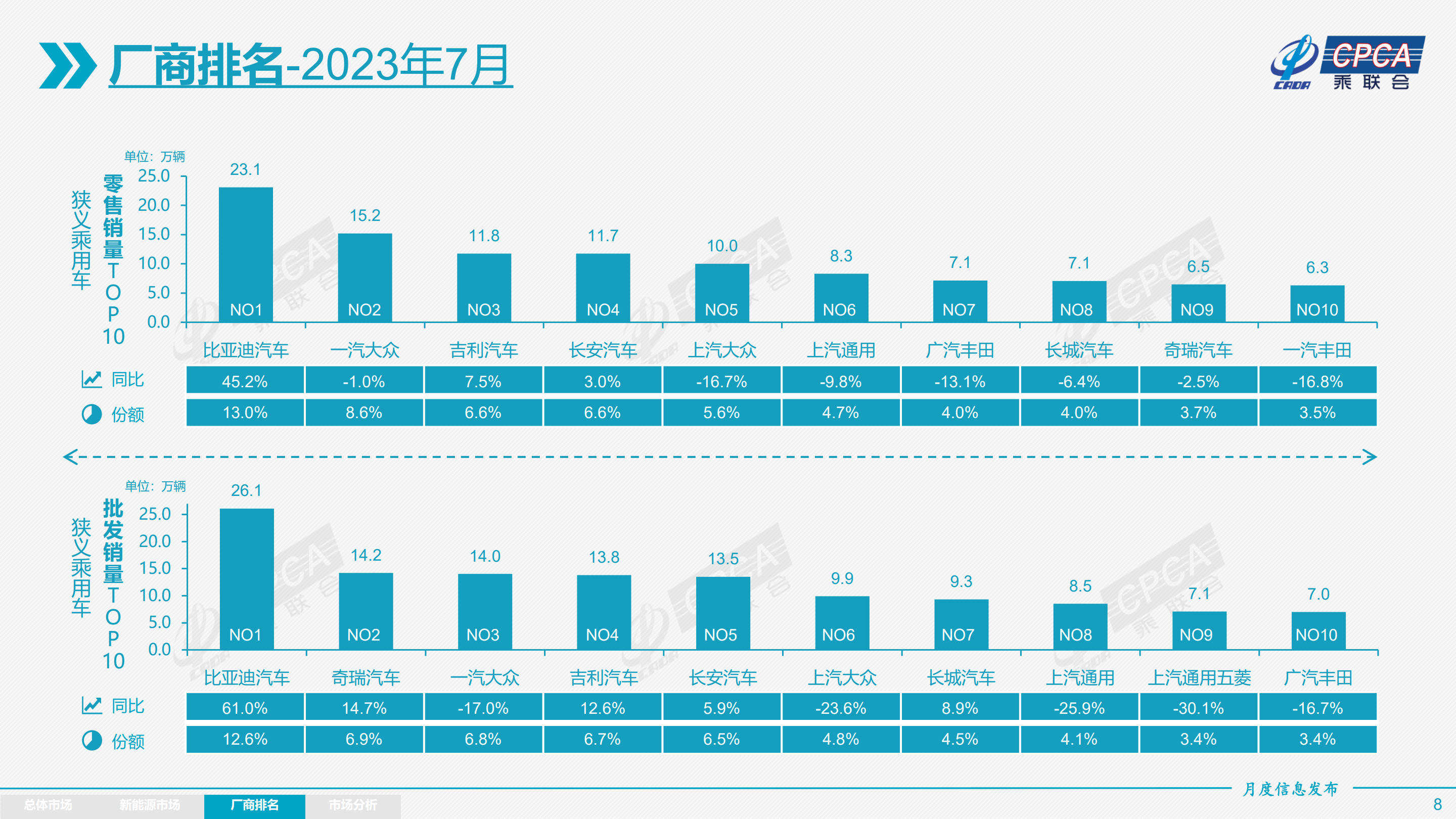 广义乘用车零售销量:7月前三名分别是比亚迪汽车、一汽-大众、长安汽车。