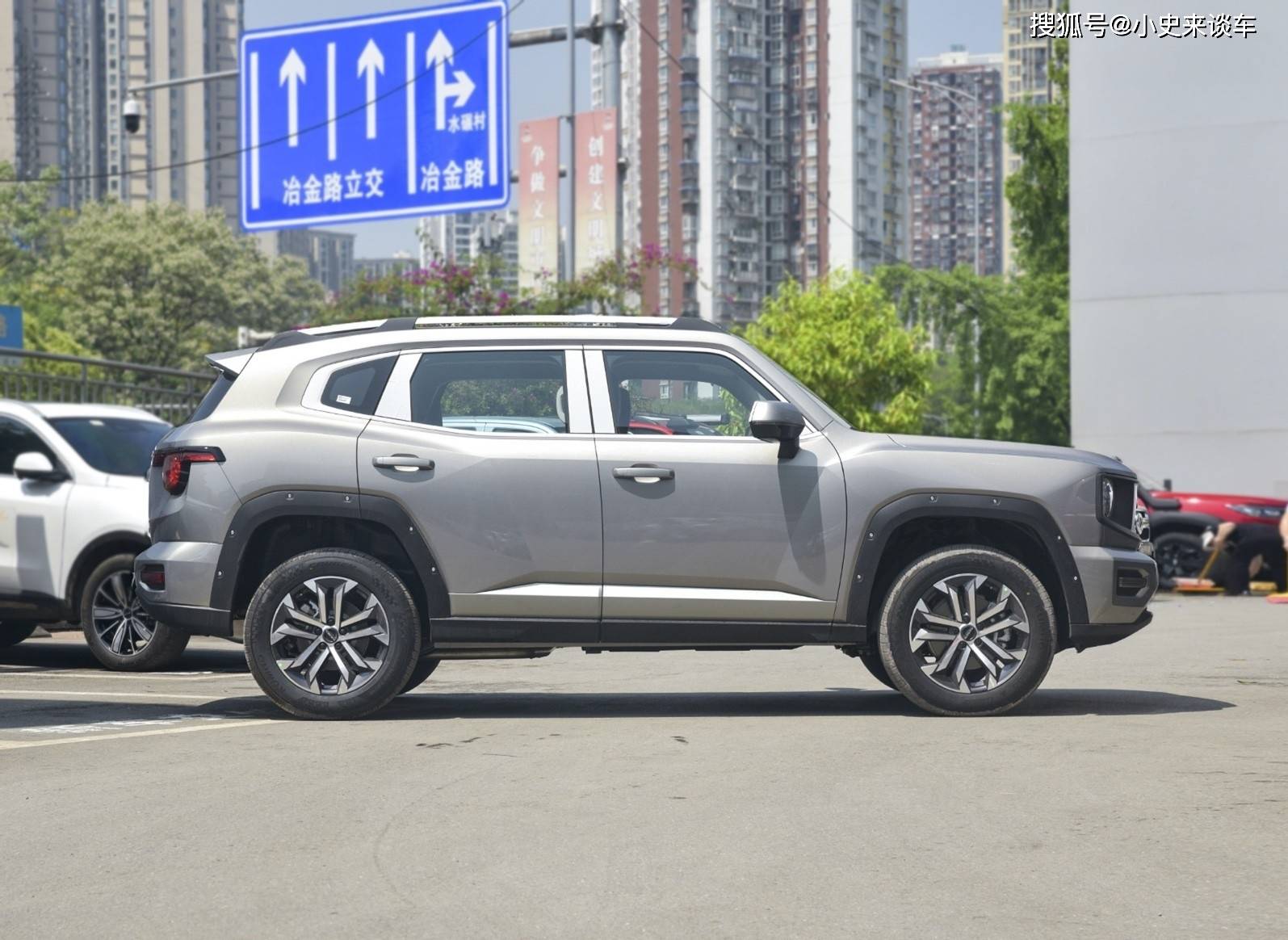 再来看新车的侧面部分,新车的车身造型十分的厚重且饱满,车顶部分还有着下滑明显的溜背式造型设计,而且突出明显的行李架也是让新车的越野感更加出众, 尤其是下方内凹式的车窗部分还有着大面积的镀铬饰板镶嵌来提升精致感,下方车门有着整体隆起的贯穿式腰线设计,而且车门下方笔直的内凹式线条也是提升着新车的层次感,前后轮眉部分整体都采用了突出的饱满造型,还有着宽厚的熏黑饰板镶嵌,结合大尺寸的花瓣式轮毂也是让新车运动感更加的出众。