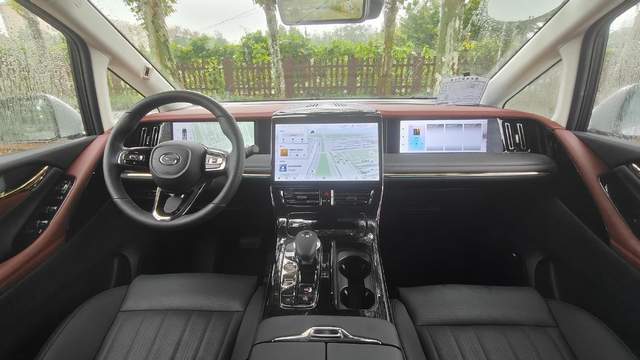 进入车内,传祺E9的内饰采用全视中控台+环抱式座舱设计,整体以深色系为主,在边框处用到了镀铬饰条作为装饰,提升了车内装饰的精致感,传祺E9还搭载了12.3英寸副驾娱乐屏、15.6英寸二排吸顶屏、14.6英寸悬浮式中控屏等科技屏幕,整车16个雅马哈扬声器音响,看剧、学习、娱乐,互不打扰,每一排都是最佳席位。