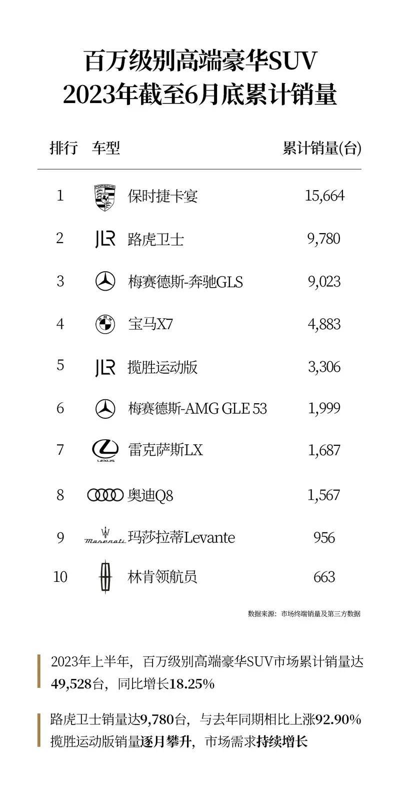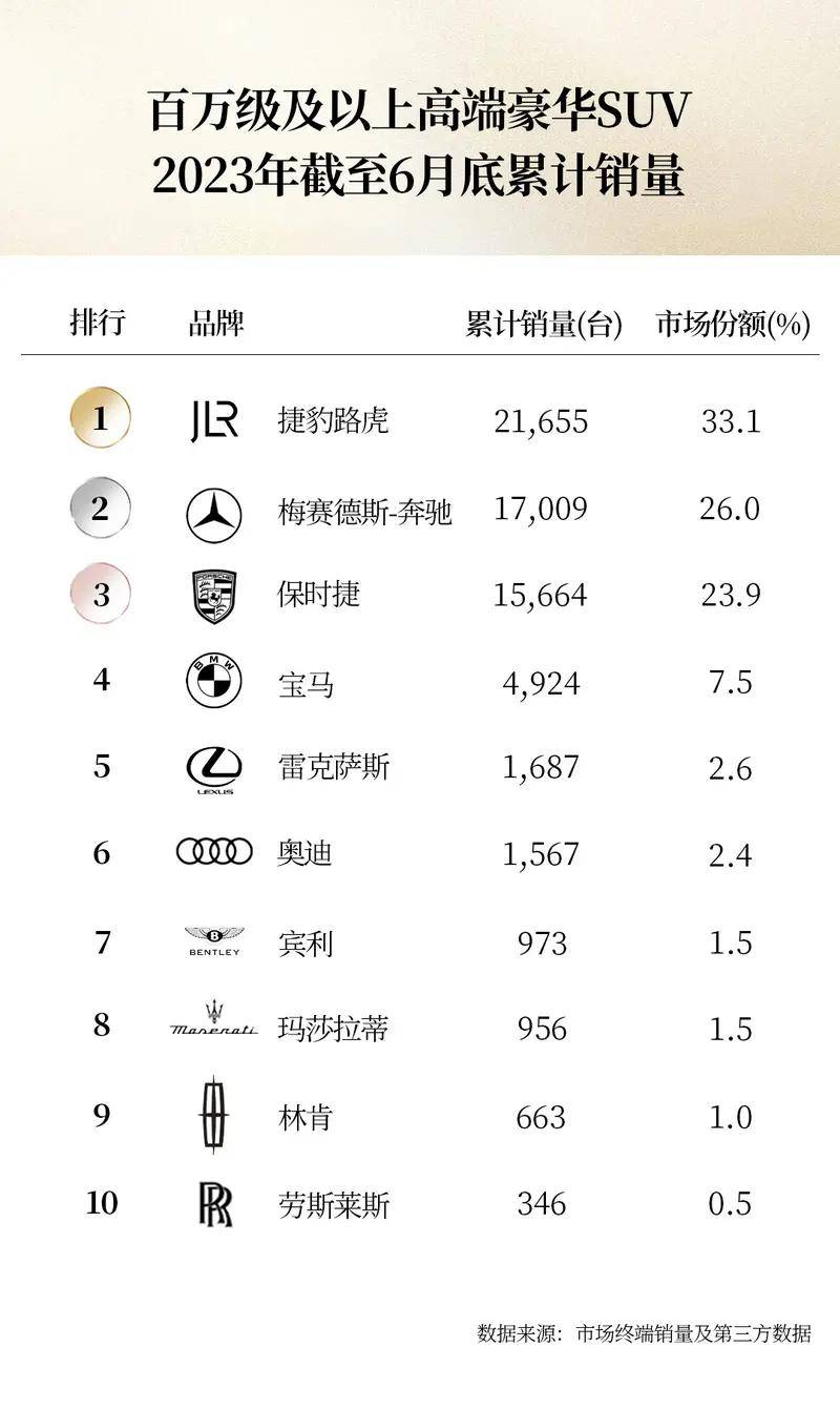 比如近期,关于百万级SUV、以及一百五十万级以上SUV的半年销量排行榜刷屏了。榜首的名字让人有些意外,是捷豹路虎。论品牌,捷豹路虎(JLR)上半年百万及以上的SUV销量高达21655辆,占据超过33%的市场份额,而一向在高端市场剑拔弩张的保时捷和BBA们面对眼下的情况似乎也有点有心无力,因为跟捷豹路虎比,就算排名第二的奔驰也被落出了将近5000台的量。论产品,一百五十万级别以上的SUV车型中,揽胜 ( 参数 | 询价 | 图片 ) 连续6个月拿下销冠,细分市场占比拿下5成以上,同比去年大增接近125%。