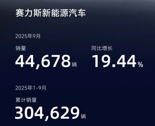 近日,赛力斯发布9月产销快报。数据显示,赛力斯新能源汽车9月销量达44,678辆,同比增长19.44%;2025年1-9月累计销量更是达到304,629辆,保持稳健增长态势。赛力斯在核心技术领域的持续深耕,成为保持产销数据正向增长的关键动力,尤其是赛力斯超级增程对产品力的赋能,正转化为市场端的显著优势。