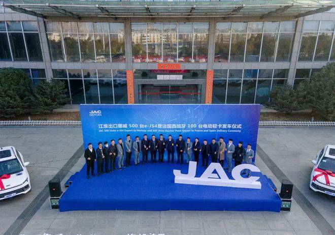 ▲江淮汽车出口挪威500辆电动乘用车暨法国西班牙100辆电动轻卡发车仪式