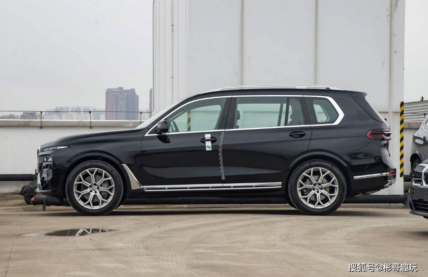 车身侧面,宝马X7采用了大量银色饰条进行装饰,包括车顶行李架、车窗框、车门下沿、前翼子板等部分。从侧面看,宝马X7的车身腰线尤为平直,结合整体硬朗的车身设计,显得整车更加厚重。