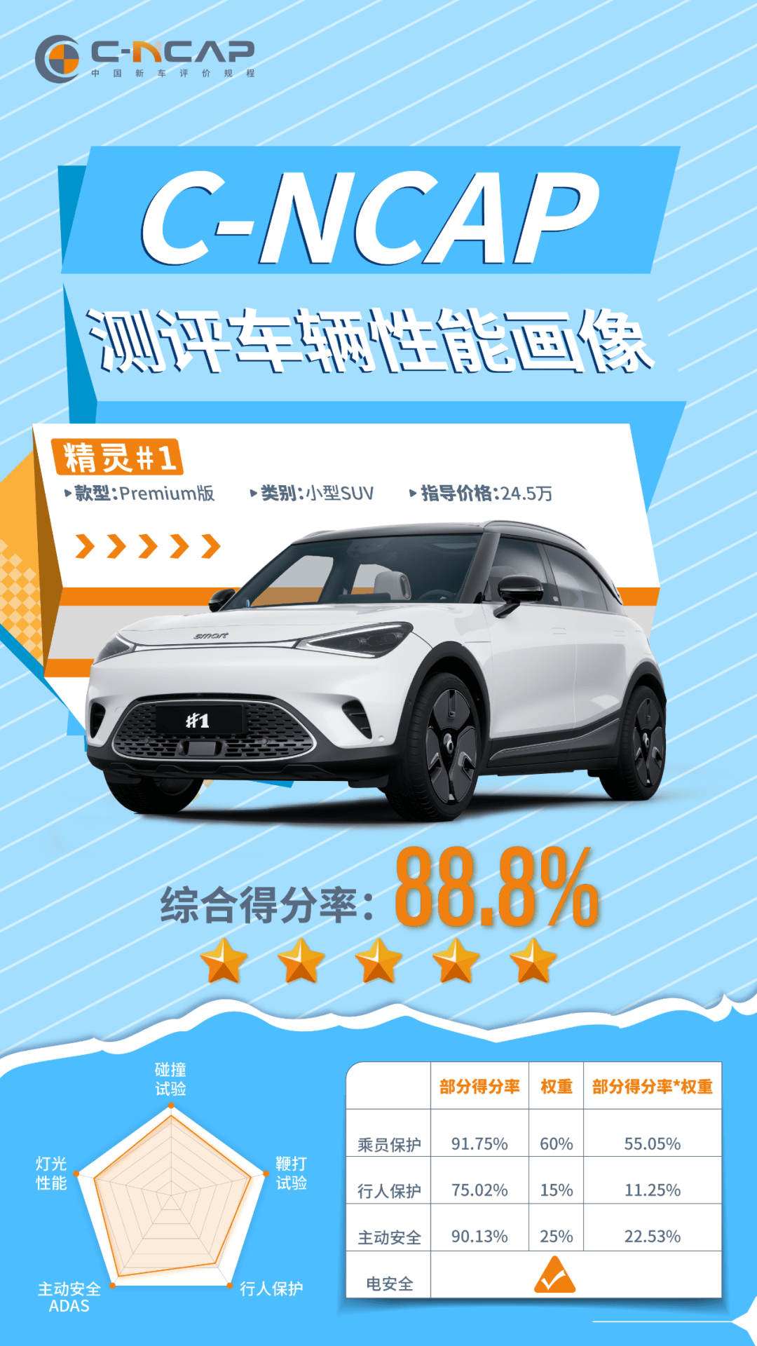 日前,smart旗下纯电车型smart精灵#1以综合得分率88.8%摘得中国新车评价规程(C-NCAP)五星安全认证。此前还曾获得欧洲新车安全评鉴协会(Euro NCAP)汽车安全测试“五星安全认证”。中欧双五星,彰显出smart品牌坚实可靠的安全防护水准。