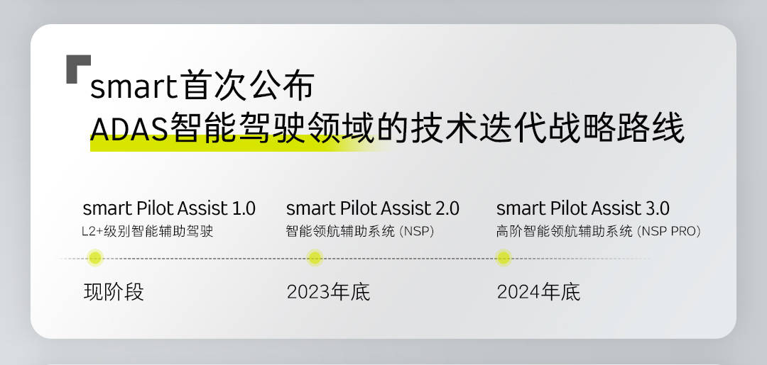 预计年底前后可以上线smart Pilot Assist 2.0版本,产品线搭载的NSP智能领航辅助系统,可实现高速及高架上的智能领航驾驶;而其3.0版本将搭载NSP PRO高阶智能领航辅助系统,预计会在2024年底左右上线。