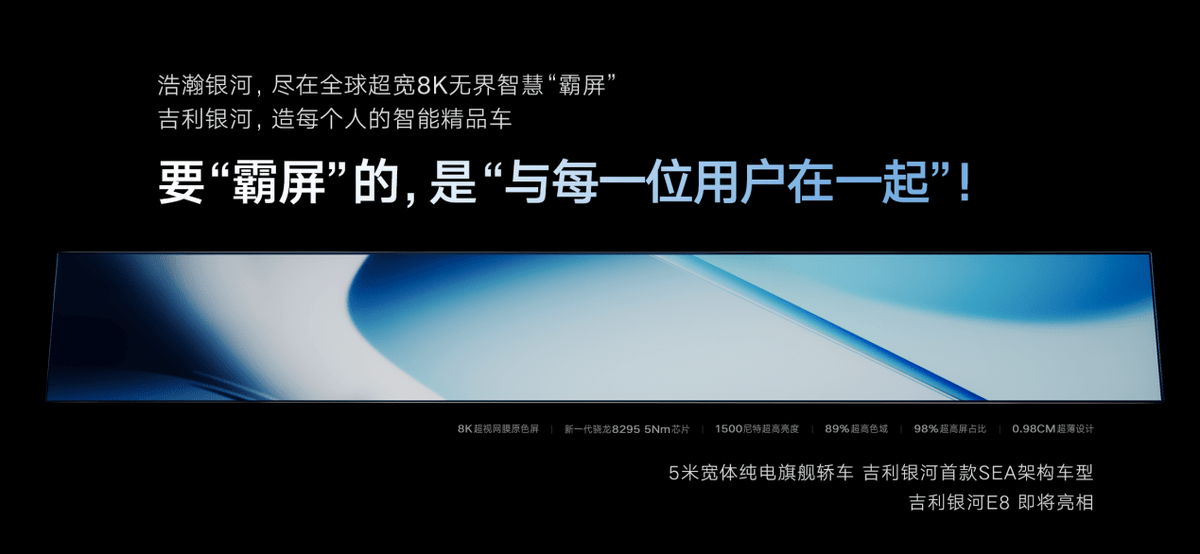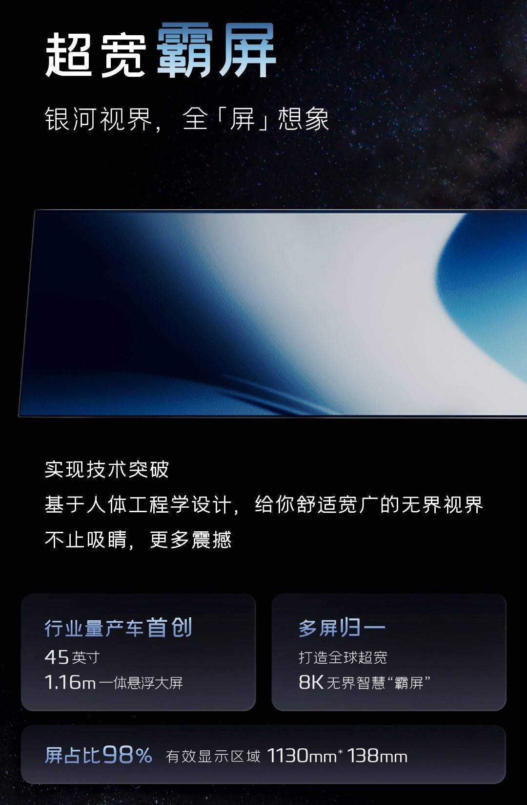 首先,吉利银河E8的最大亮点当属其搭载的45英寸8K无界智慧霸屏。这一创新突破了汽车屏幕的行业瓶颈,不仅在尺寸上大幅超越了传统汽车屏幕,同时高清的画质也给用户带来了更加逼真的视觉享受。用户可以通过触摸屏、语音识别等多种方式与智能座舱系统进行交互,实现人机沟通的无缝连接。