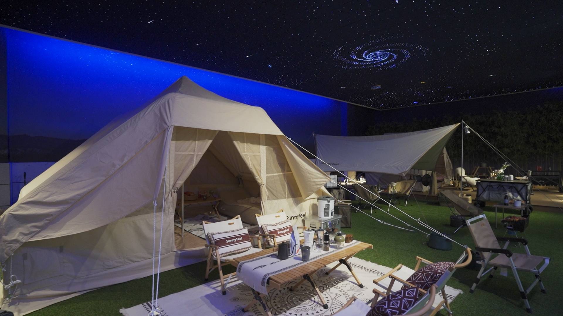 山扉SunnyFeel的山顶补给站,搭建了居家亲子露营、宅野过夜露营和精致烧烤露营三个场景,提供沉浸式场景露营体验。