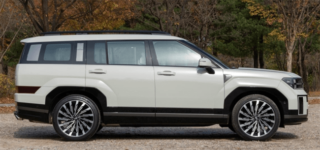 侧身方面,新车同样维持着方正的造型,气质硬朗。ABCD柱均进行黑化处理,营造出悬浮式车顶的观感。车顶线条略微下倾,将视觉重心向后拉伸。轮眉上方的线条粗壮,力量感十足。车身侧沿有较宽的黑色线条,尽可能地抬升了底盘在视觉上的高度。