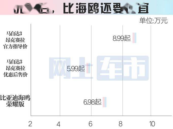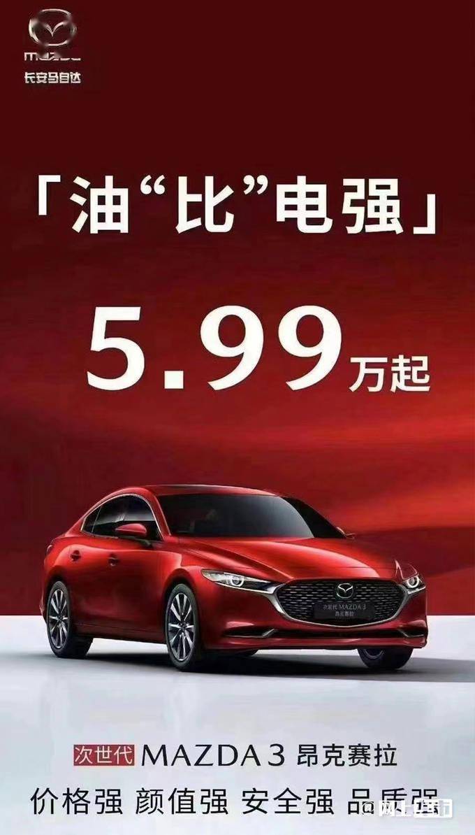 网上车市获得了一张马自达3 昂克赛拉的优惠宣传海报,图中显示起售价低至5.99万元,较现官方指导价便宜了3万元,比低一级的纯电轿车比亚迪海鸥还便宜。