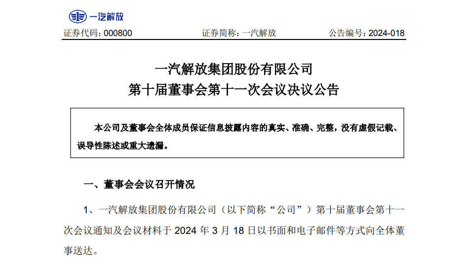 近日,一汽解放集团股份有限公司(以下简称“一汽解放”)发布第十届董事会第十一次会议决议公告。