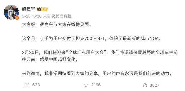 2024年3月26日,长城汽车董事长魏建军微博创号以来首次发文:“大家好,很高兴与大家在微博见面。3月30日,我们将迎来‘全球坦克用户大会’,我们将邀请热爱越野的全球车主前往云南,感受中国越野文化。”