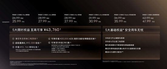 10月28日,阿维塔科技宣布阿维塔12四激光版正式上市,推出纯电和增程双动力共6个车型版本,官方指导价为26.99万—42.99万元,权益后到手价为25.99万—41.99万元。