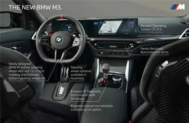 内饰方面,新车采用了全新设计的多功能方向盘,同时配备搭载iDrive 8.5车机系统的曲面双联屏设计,而电子换挡机构保留了经典的鸡腿档把,保留了M车型的运动属性。